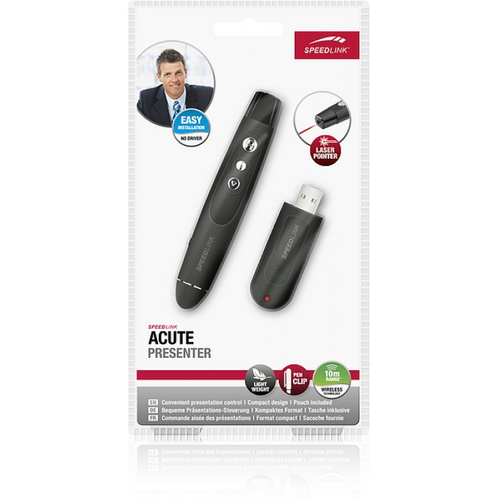 المميزات | ريموت عرض مزود بمؤشر ليزر. ريموت لاسلكى يعمل حتى مدى 10 متر. يحتوى على إثنان من أزرار التحكم للتحكم المناسب فى ملفات PowerPoint®, Keynote. مدمج بالريموت مؤشرليزر ذو لون أحمر. ريموت عرض ذو تصميم مضغوط فى شكل قلم مزود بمشبك. خفيف الوزن. ذو تصميم غير قابل للإنزلاق. يحتوى على مستقبل إشارة يو إس بى يتميز بالسهولة فى تركيبه وتشغيله. يحتوى على حقيبة للحمل والإنتقال الآمن به. يتضمن بطارية (مقاس A23 , فولت 12Volt). |