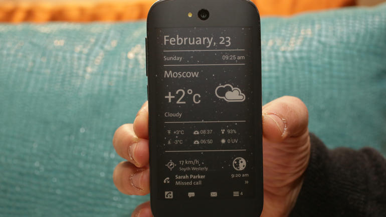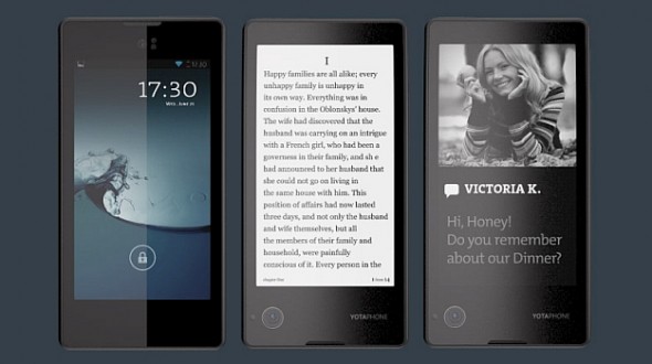 وقامت الشركة الروسية بعرض جهازها الذي يأتي بشاشة أمامية ملونة، وأخرى خلفية باللونين الأبيض والأسود، وهي ذات استهلاك منخفض للطاقة وتعمل بتقنية الخبر الإلكتروني e-ink، وذلك خلال المؤتمر الذي انطلقت فعالياته اليوم الإثنين بمدينة برشلونة الإسبانية.