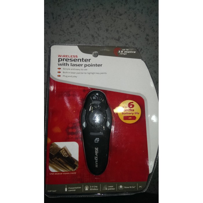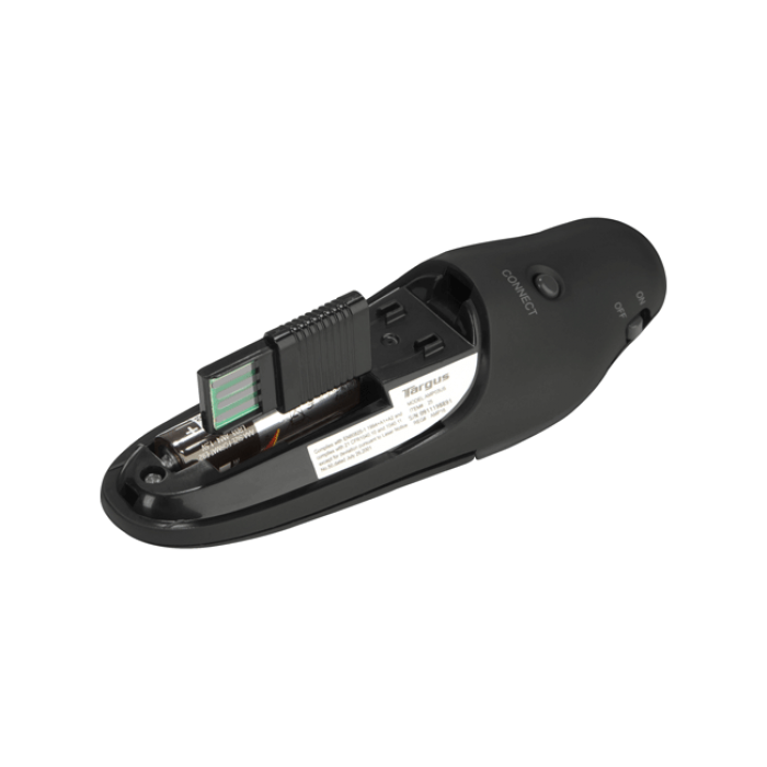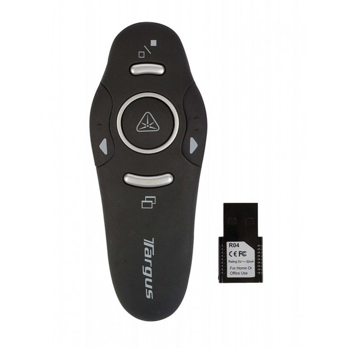 المميزات | مدمج به مؤشر ليزر للوصول إلى أفضل النقاط الرئيسية في تسليط الضوء على العروض التقديمية. مستقبل إشارة USB لاسلكى قابل للتخزين و متناهى الصغر لقابلية الحمل والراحة. بساطة التوصيل والتشغيل عبر منفذ USB، لا حاجة لبرامج تشغيل. نوع البطارية المستخدمة : عدد 1 بطارية مقاس AAA. |