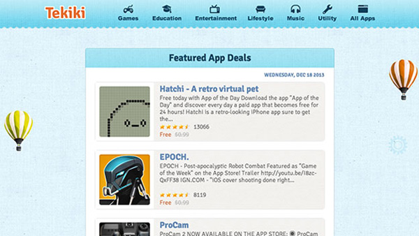 توفر شركة «أبل» يومياً بعض التطبيقات مجاناً ليوم واحد أو تخفض أسعار بعض التطبيقات فترة مُعينة، وعلى الرغم من عرض هذه العروض في موقع تطبيقات  أبل ، إلا أنها لا تكون واضحة دائماً، لذا يمكن للمستخدمين الاستعانة بموقع www.tekiki.com  الذي يقدم قائمة بالتطبيقات التي عرضتها الشركة، سواء مجاناً أو بسعر مُخفّض.